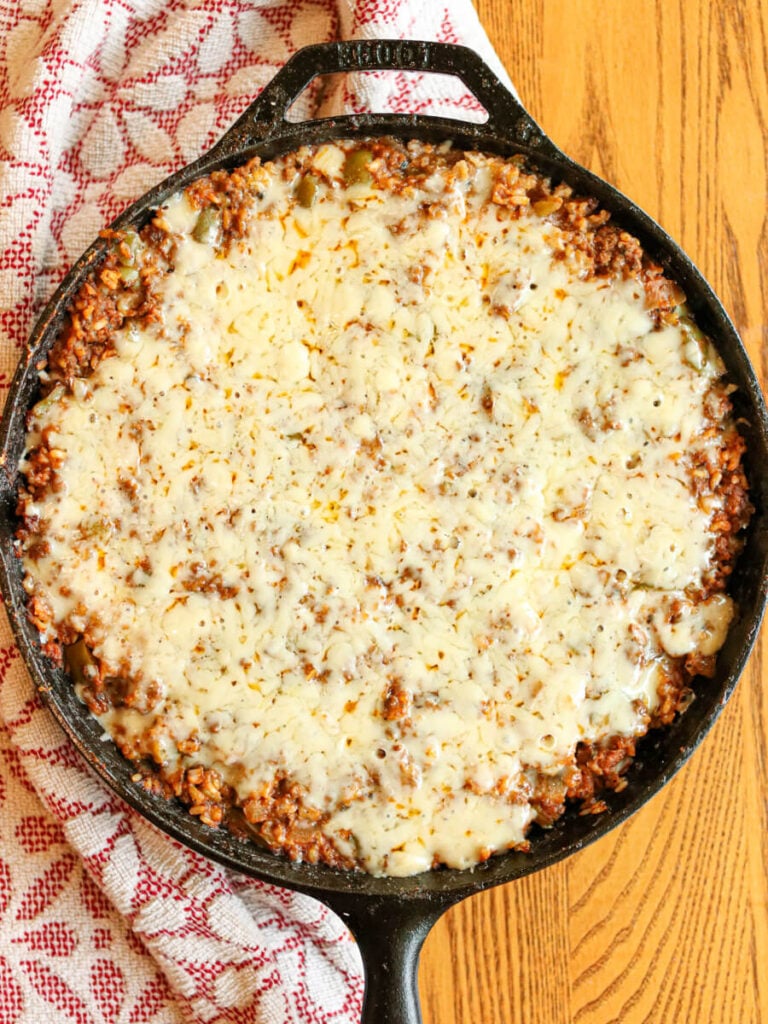 Simple and flavorful, this cheesy deconstructed stuffed peppers skillet makes the perfect healthy dinner! Beef, peppers, and brown rice is simmered together in a rich sauce and topped with shredded parmesan for a hearty one-pot meal the whole family will love.