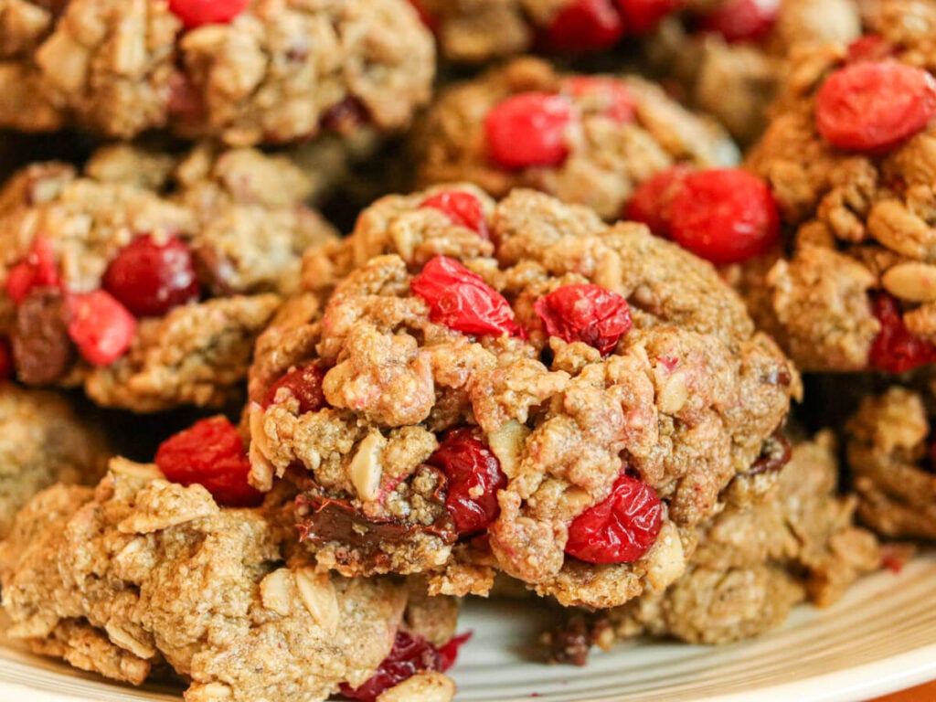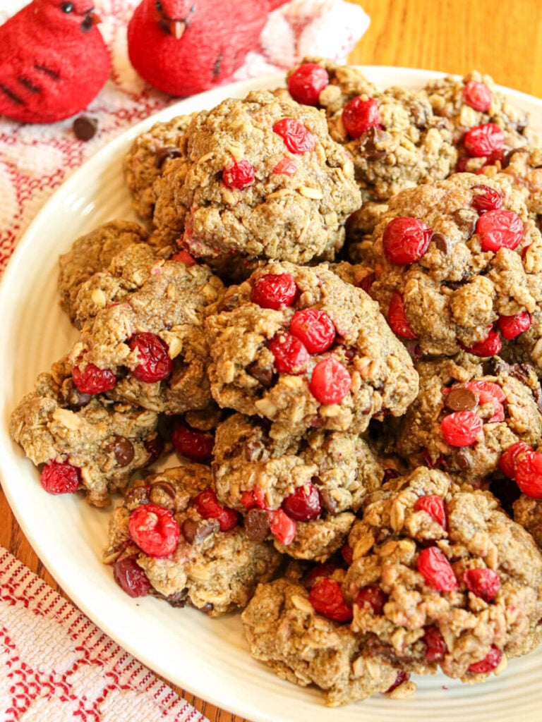 This recipe is a holiday twist on my favorite chocolate chip oatmeal cookies. Not only do the cranberries add an incredible punch of flavor, but their bright red color makes the cookies look just like Christmas!